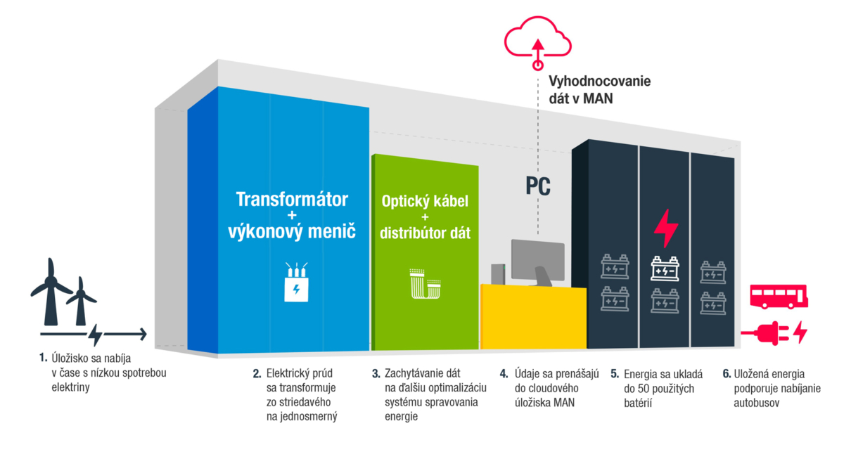 Úložný systém na „druhé použitie“ autobatérií je produktom memoranda o porozumení, ktoré dopravný podnik VHH a MAN Truck & Bus podpísali v marci 2018. Keďže priama likvidácia použitých batérií z motorových vozidiel nie je ekologická, obe firmy chcú otestovať, ako sa dajú takéto batérie využiť v stacionárnom úložisku energie.
