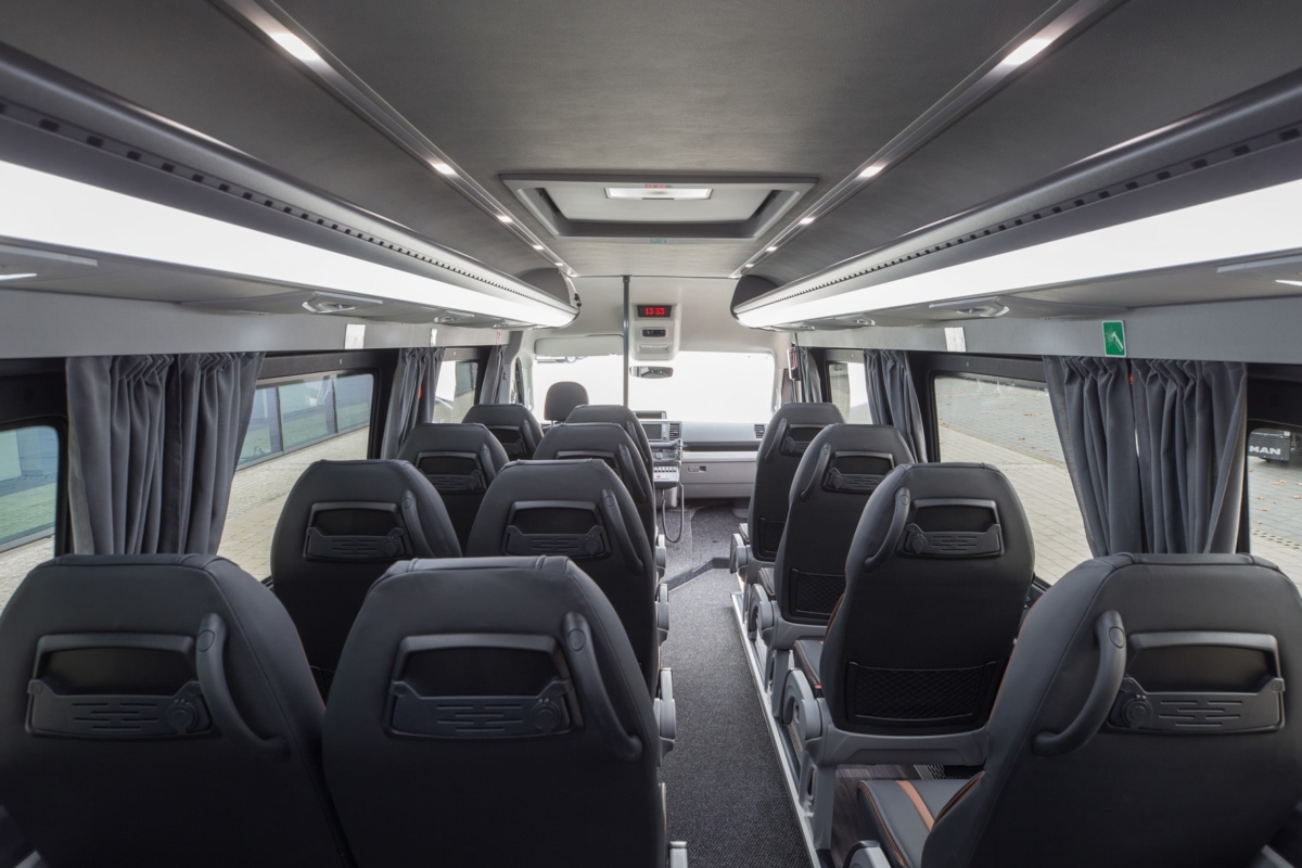 Vďaka celkovej hmotnosti 5 ton môže byť toto exkluzívne zájazdové vozidlo vybavené až 16 sedadlami v rôznych konfiguráciách, čo z neho robí ideálnu voľbu pre malé turistické skupiny a kyvadlovú prepravu. Sedadlá s trojbodovými bezpečnostnými pásmi spĺňajú vysoké štandardy kvality, na výber sú dve verzie koženého dizajnu alebo poťahové materiály z kolekcie pre autobusy MAN.