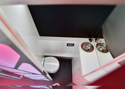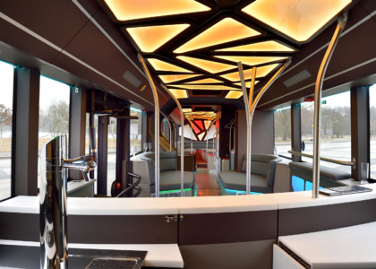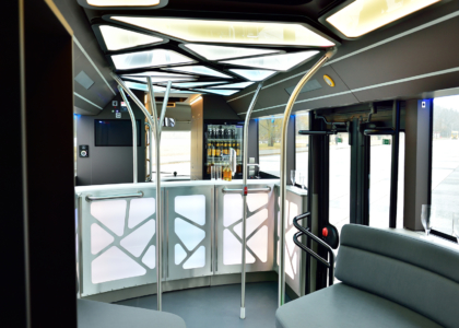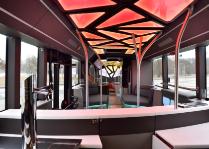 Dômyselným detailom sú magnetické držiaky pohárov, takže nápoje sa aj počas jazdy dajú bezpečne postaviť na stôl. Obzvlášť zaujímavo pôsobia držadlá, ktoré sa obratne týčia nahor. „Bolo pre nás dôležité navrhnúť tieto základné elementy kreatívne a vytvoriť tak vizuálne interesantné zóny,“ zdôrazňuje H. Kiess. Autobus má navyše aj luxusné WC.