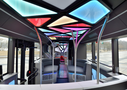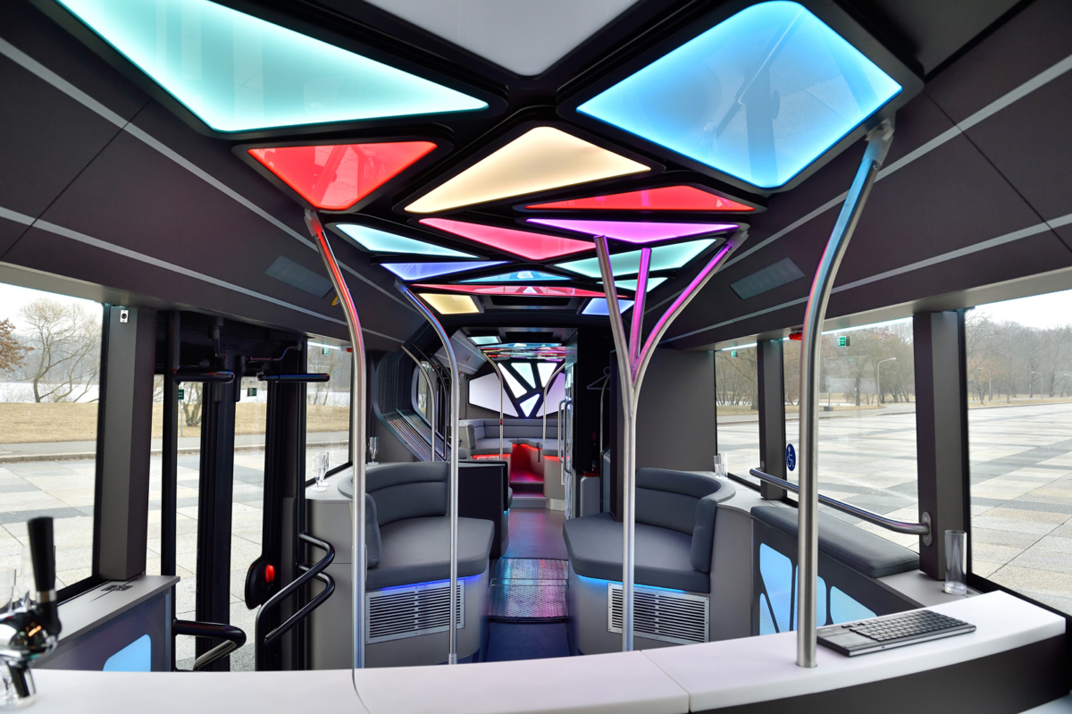Dizajnéri osvetlenia a vývojári sa sústredili na individuálne a originálne riešenia: exkluzívny koncept pixelov z LED svetiel aj svietidlá v oddychovej zóne s technológiou LED vytvárajú fascinujúce efekty a pôsobivú svetelnú šou v rytme hudby. Hi-fi systém s reproduktormi s výkonom 5 x 700 wattov bol vyvinutý špeciálne pre interiér tohto autobusu a prispôsobený jeho akustickým vlastnostiam. V zadnej časti vozidla sú umiestnené dva 5-kilowattové meniče prúdu, ktoré poskytujú energiu pre svetelný, resp. zvukový systém, router bezdrôtovej siete, dve lítiovo-iónové batérie a riadiaci systém batérií.