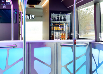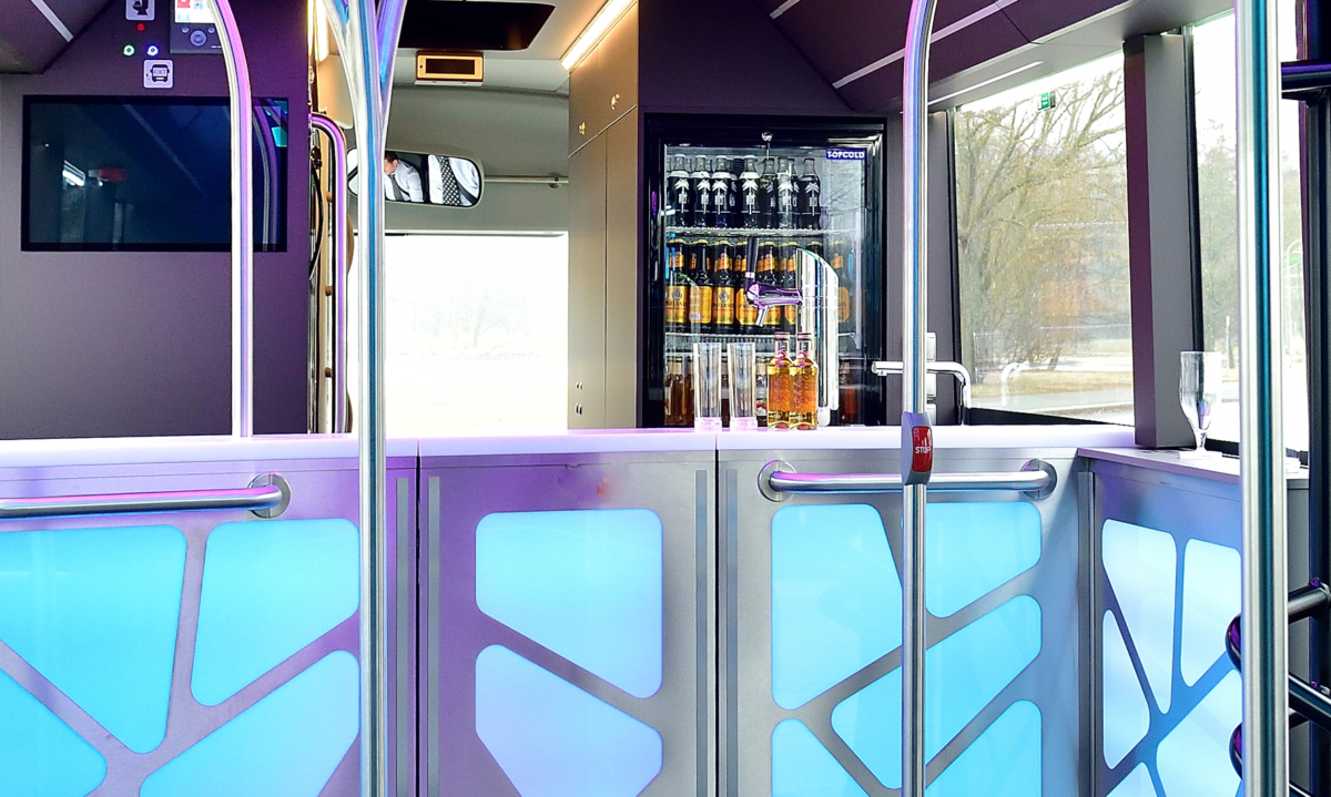 Večer sa začína, je čas na šou. Ale aj cez deň je tento Lion’s City GL pozoruhodný. Stredisko špecializované na individuálne úpravy autobusov – MAN Bus Modification Center – zmenilo mestský kĺbový autobus na diskotékový klub so všetkým, čo k tomu patrí vrátane štýlového baru. Barový pult s krídlovými dverami skrýva tri chladničky a pivný výčap s chladením sudov. Nechýba panel pre diskdžokeja, na ktorom sa ovláda profesionálny zvukový systém so zabudovanými reproduktormi, subwooferom i bezdrôtovými reproduktormi.