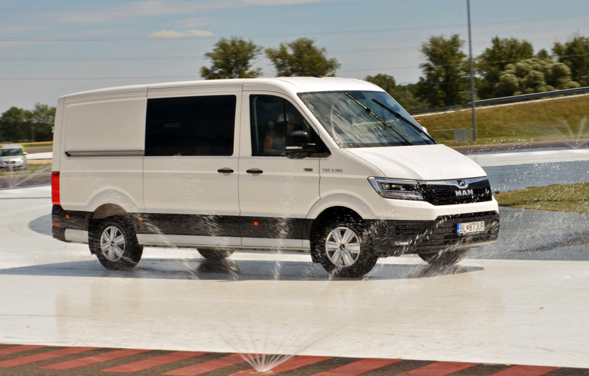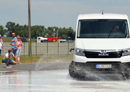 Potom sa naša skupinka – sestry sprevádzali rodičia i brat – presunula na „klzisko“ Centra bezpečnej jazdy. Tam sa dievčatá stretli so svojím dobrým známym – bielym vanom TGE 4×4, ktorý ich uplynulú zimu vozil po Európe na preteky svetového pohára. Nácvik správnej reakcie na náhly šmyk, bezpečný prejazd zákrutou s klzkým povrchom… Biatlonistky si manévrovanie a šmyky očividne vychutnávali až do poslednej minúty vyhradeného času.