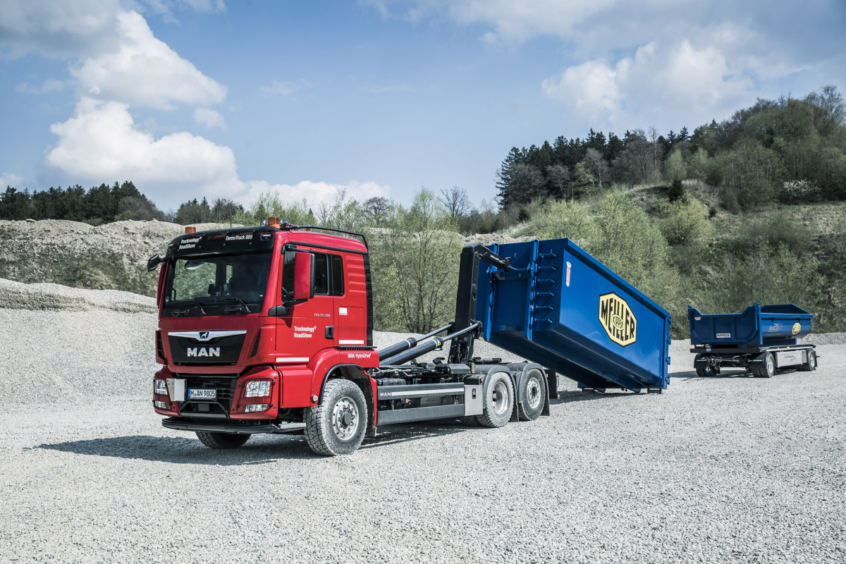 Stredne vysoké šasi so zapínateľným pohonom predných kolies MAN HydroDrive garantuje zvýšenú trakciu. Tento exponát prezentuje nový motor D26 Euro 6 a systémy ComfortSteering a LaneReturnAssist. Pri celkovej hmotnosti ťažného vozidla a prívesu 59 ton je to ideálny truck na prepravu stavebných strojov.