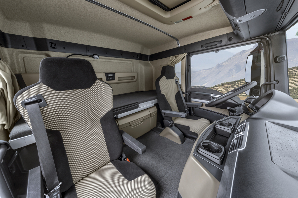 Premiestnením otočného spínača TipMatic sa vytvorilo viac miesta medzi sedadlami a pred lôžkom. Chladiaci/odkladací box tiež prispieva k tomuto priestoru navyše, pretože v dlhej kabíne sa dá úplne zasunúť pod lôžko. Chladiaci box je väčší ako predtým – má kapacitu 35 litrov a funkciu rýchleho chladenia. Alternatívne si možno objednať veľkú uzamykateľnú skrinku.