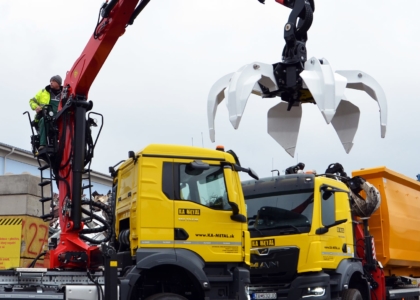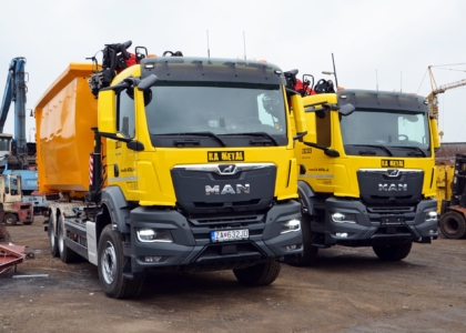 Dva nové prírastky sú identické: trojnápravové podvozky MAN TGS 33.510 6×4 BB CH so zosilneným rámom, s 375-kilowattovým motorom (510 k) a automatizovanou prevodovkou MAN TipMatic 12:28 s retardérom aj s funkciou vyslobodenia vozidla rozhojdaním. Kabíny veľkosti NN (vonkajšia dĺžka 1880 mm, vonkajšia šírka 2240 mm) s LED prednými svetlami majú vo výbave nezávislé vodné kúrenie i automatickú klimatizáciu. Pri pohľade na voliteľnú špecifikáciu fanúšik truckov môže vodičom firmy KA-METAL závidieť: multifunkčný volant a komfortné vyhrievané sedadlo, 12,3-palcový digitály prístrojový panel, elektrická parkovacia brzda, dažďový snímač, sofistikovaný, ale súčasne užívateľsky príjemný systém ovládania infotainmentu MAN SmartSelect a rádio s navigáciou so 7-palcovým displejom, kamera pre cúvanie… Už z tohto prehľadu vidno, že majitelia spoločnosti na užitočnej príplatkovej výbave naozaj nešetrili. Takže z najnovších prvkov objednali i MAN EasyControl – ovládací modul vo dverách vodiča, ktorým možno až 4 zvolené funkcie ovládať aj po vystúpení z kabíny a tiež ComfortSteering, čiže elektronicky regulovaný hydraulický systém riadenia (perfektný pomocník pri každodennom manévrovaní na malej ploche: vodič riadi vozidlo veľmi presne s minimálnou námahou, pričom sa volant samočinne vracia do strednej polohy).